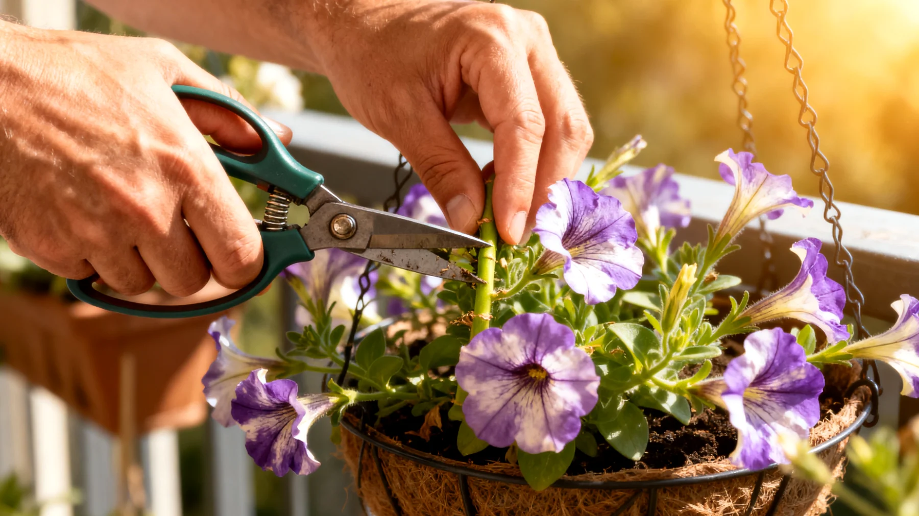 La terza pratica fondamentale è la rimozione continua dei fiori appassiti. Lasciarli sulla pianta non solo sottrae estetica, ma induce la pianta a convogliare energia nella produzione dei semi, rallentando drasticamente la generazione di nuovi fiori. Ogni fiore rimosso stimola la pianta a produrre nuovi boccioli nel tentativo di completare il ciclo riproduttivo. Usando queste tre tecniche in modo coordinato, anche una sola surfinia può diventare un cespuglio compatto, fiorito e resistente, capace di produrre centinaia di fiori contemporaneamente.